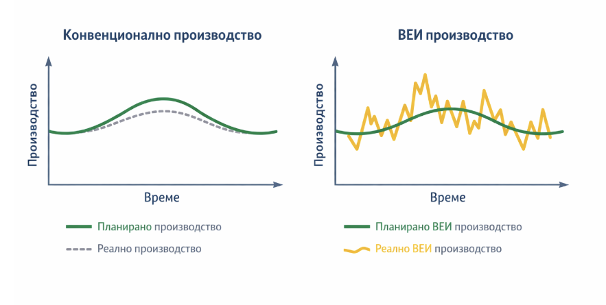 За разлика от конвенционалните електроцентрали, производството от ВЕИ е по своята същност променливо и недиспечеруемо. То зависи от метеорологичните условия, а не от моментното потребление в системата. Това означава, че в рамките на минути или часове в мрежата могат да възникнат значителни отклонения между производство и търсене. За системния оператор това представлява сериозно предизвикателство, тъй като балансът трябва да се поддържа непрекъснато, за да се гарантира сигурността на електрозахранването и стабилността на честотата.