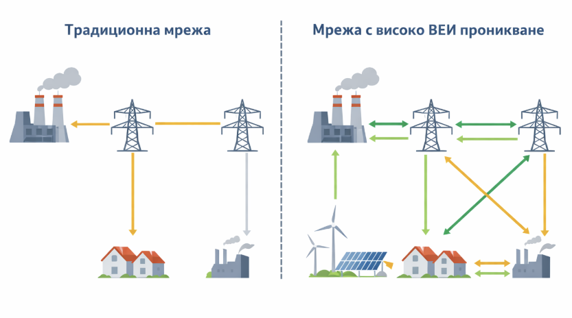 Паралелно с това се променя и самият характер на електроенергийната мрежа. Исторически тя е проектирана за еднопосочен поток на електроенергия – от големи производствени мощности към крайните потребители. Разпределеното производство от ВЕИ, особено на ниво разпределителна мрежа, води до двупосочни потоци и до ситуации, в които енергията се „връща“ обратно в мрежата. Това създава локални претоварвания, проблеми с управлението на напрежението и по-високи изисквания към защитите и управлението на мрежата.