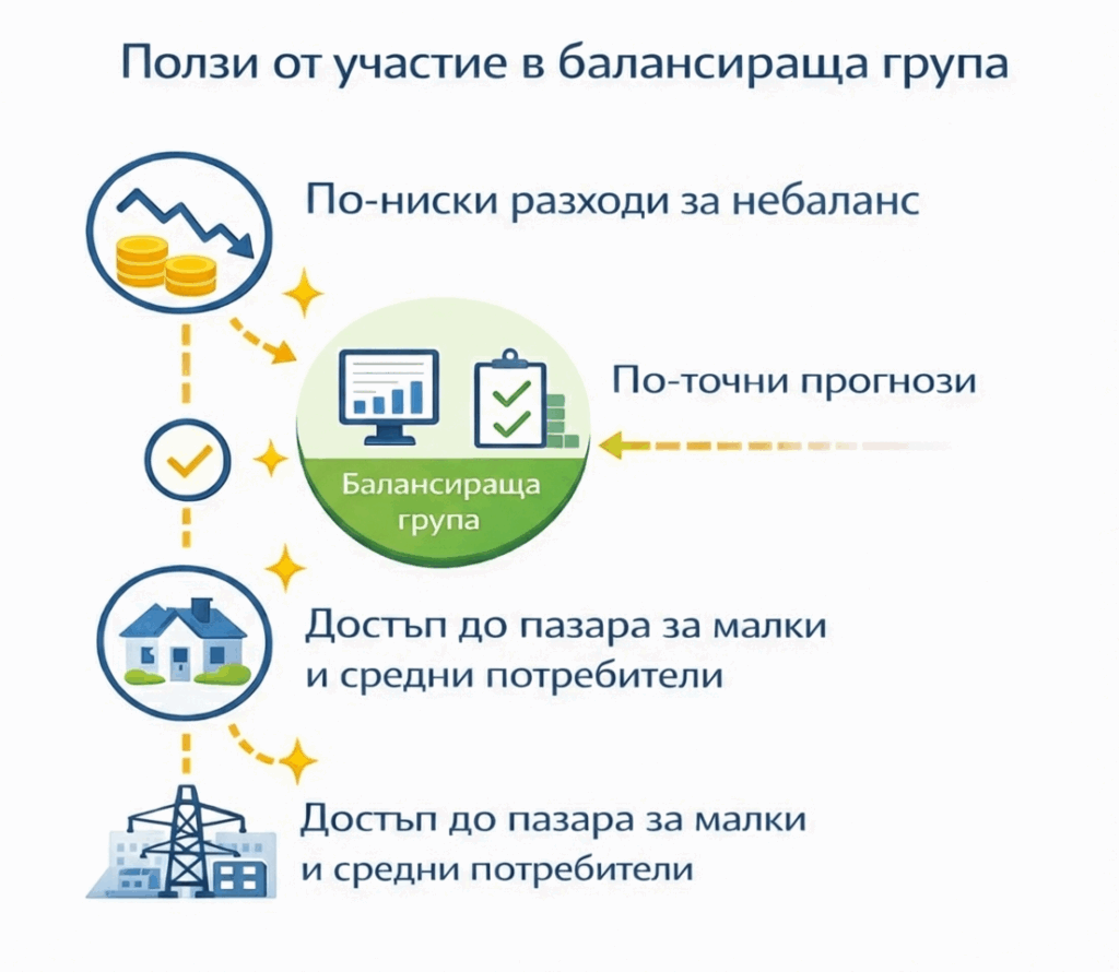 За много малки и средни потребители самостоятелното изпълнение на регулаторните и технически изисквания за участие на енергийния пазар е сложно и икономически неоправдано. Участието в балансираща група им дава възможност да бъдат част от пазара при значително по-нисък административен и финансов риск.