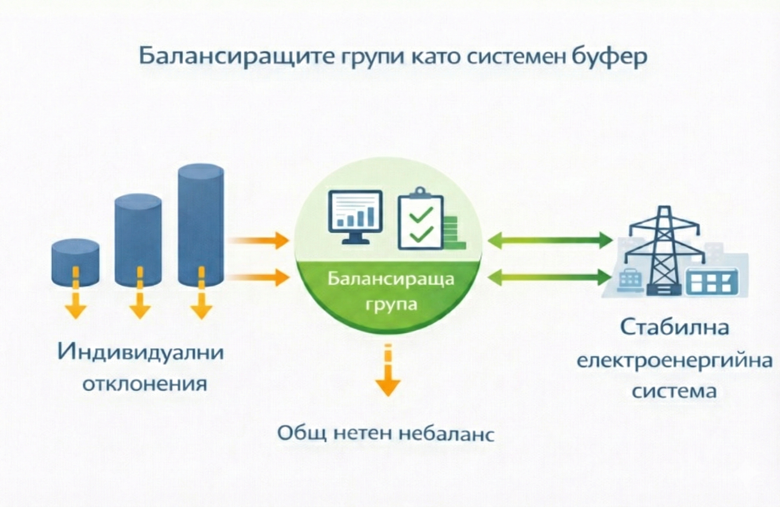 Балансиращата група обединява различни участници на пазара – потребители, производители и търговци на електроенергия – с цел съвместно управление на разликите между планираното и реалното потребление или производство. Вместо всеки участник да носи самостоятелно пълната тежест на своите отклонения, те се агрегират в общ портфейл, където индивидуалните небаланси често се компенсират взаимно.